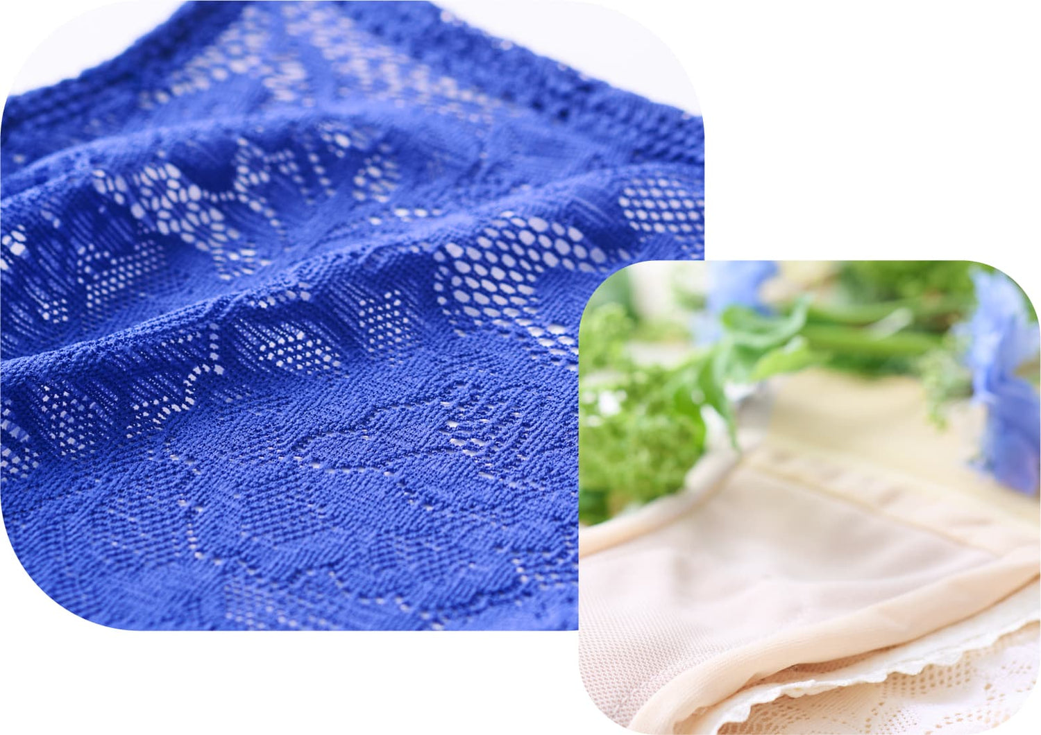 美しく魅せるパターンと伸縮性のあるレース素材で、風を纏うような着ごこちに。軽やかでソフトな肌触りは、デリケートなお肌への負担を軽減します。